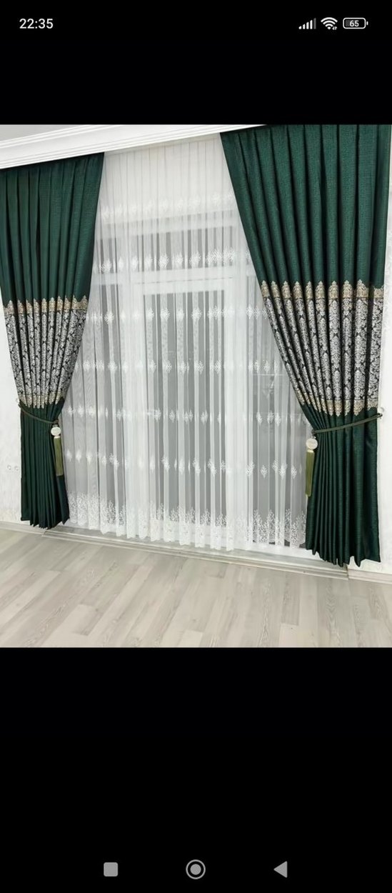 Yeşil ve gri nakışlı modern klasik tarzda perde, beyaz tül ile katmanlı ve perde bağlarıyla birlikte.