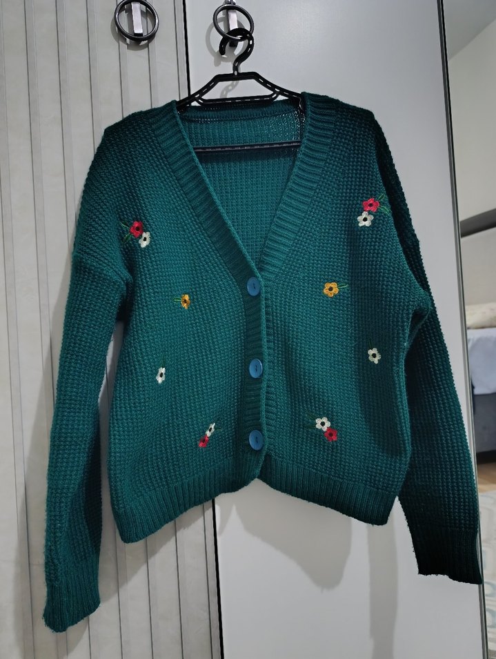 Bu koyu yeşil örgü hırka, nakışlı çiçek detayları ve salaş kesimi ile uzun kolludur. Yaka ve bohem tarzda, günlük kullanıma uygundur. (herhangi bir sıkıntı yok az giyildi)
