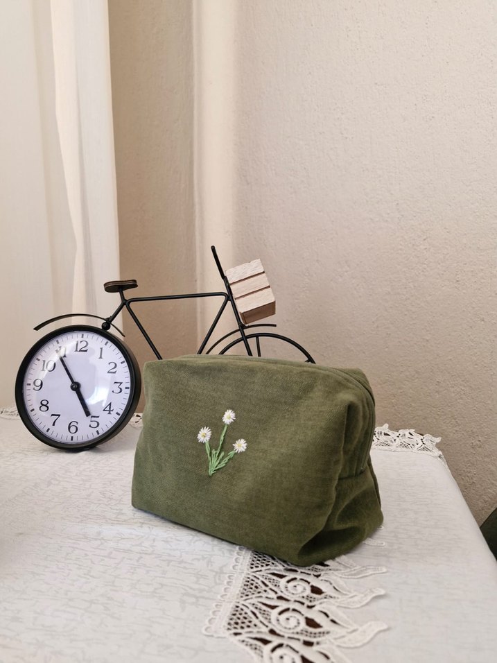 Yeşil pamuklu makyaj çantası, fermuarlı ve nakışlı çiçek detaylarıyla minimalist bohem tarzı için uygundur. Pastel tonları günlük kullanım için idealdir. Sadece makyaj çantası olarak değil, seyahat çantası olarak da kullanabilirsiniz. Boyut:19×11×8 cm