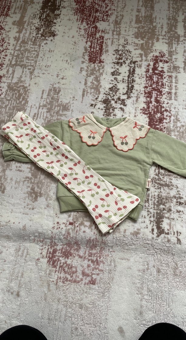 Nakışlı detaylara sahip pastel yeşil triko uzun kollu üst ve desenli pantolondan oluşan bebek kız takımı. Üstte kiraz nakışlı tırtıklı yaka bulunur.