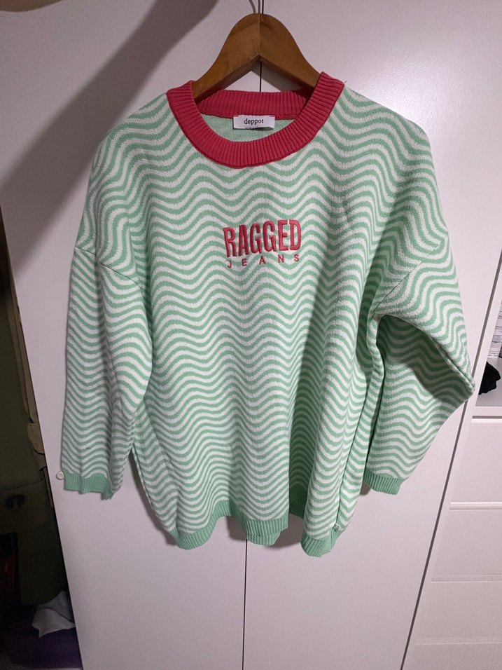 Pastel yeşil dalgalı desenli, pembe bisiklet yaka, uzun kollu, bol kesim triko kadın kazak. Önünde "RAGGED" nakışı bulunan rahat bir model. Hiç giymeye fırsatım olmadı yeni bir ürün