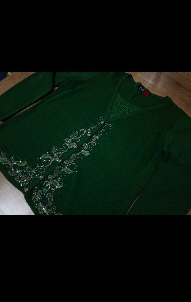 Bu yeşil, uzun kollu, v yaka triko kazak, ön kısmında nakış detaylarıyla şık ve rahat bir görünüm sunar. Günlük kullanıma uygun ve trend bir parçadır. ✨