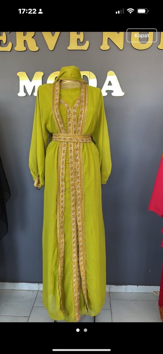 Nakışlı detaylara sahip, V yakalı, uzun kollu, kemerli yeşil uzun elbise. Rahat ve ipeksi dokulu, bol kesim bir tasarım.