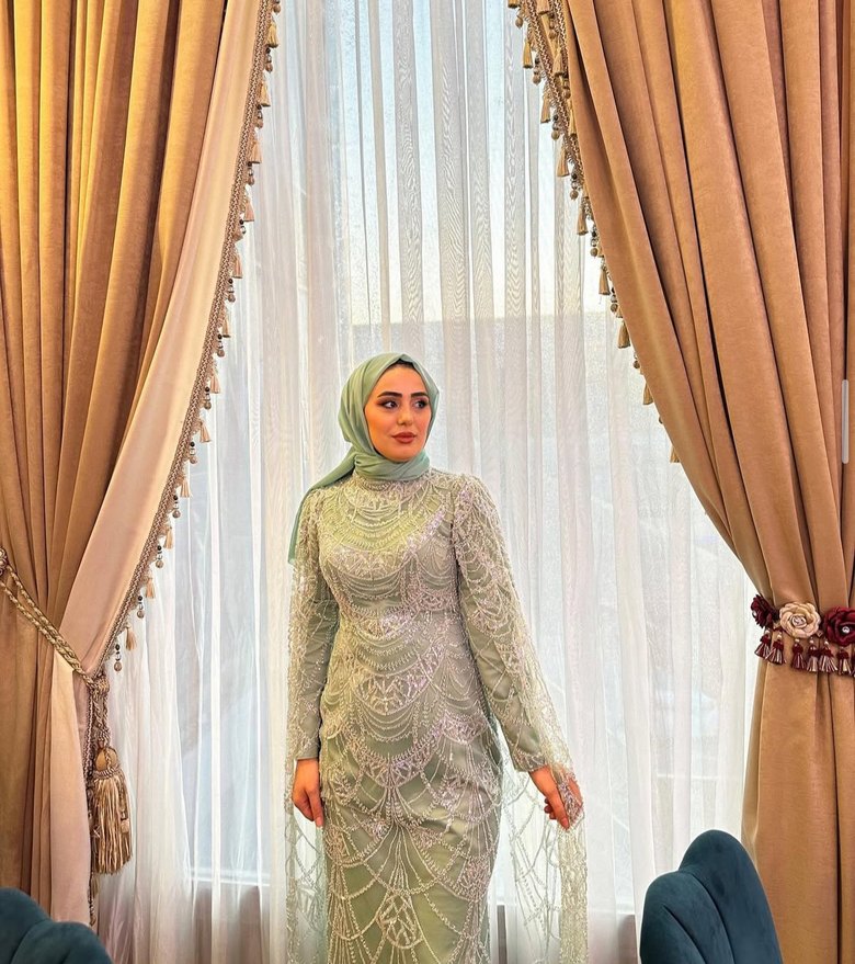 Nakışlı, yüksek yakalı ve uzun kollu khaki renkli uzun abiye elbise. Dökümlü tasarımı ve düzenli kesimiyle düğünlere uygundur. 36-38-40-42 beden satılık