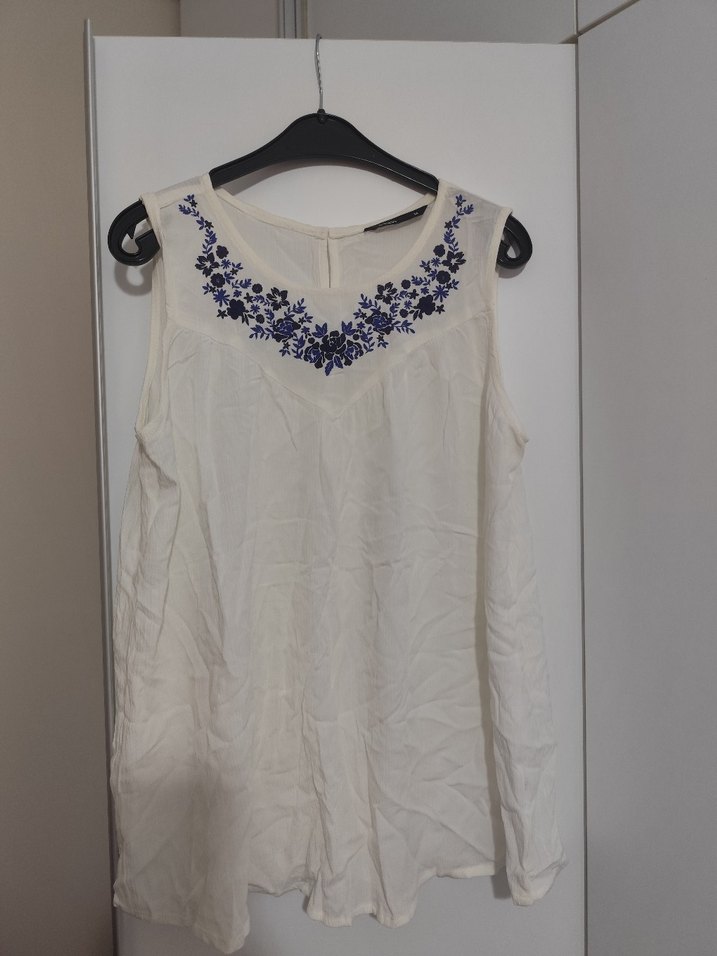 Pamuklu, kolsuz, bol kesim beyaz mini bluz, mavi nakışlı çiçek detayları bohem tarzı yansıtıyor.
