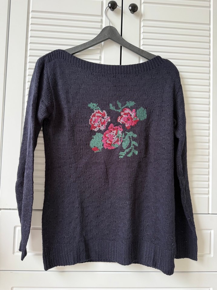Bu lacivert triko kazak, yuvarlak yaka ve uzun kollu, bol kesimdir. Önde nakışlı çiçek deseni bulunur, günlük kullanıma uygun rahat ve bohem bir stildir.