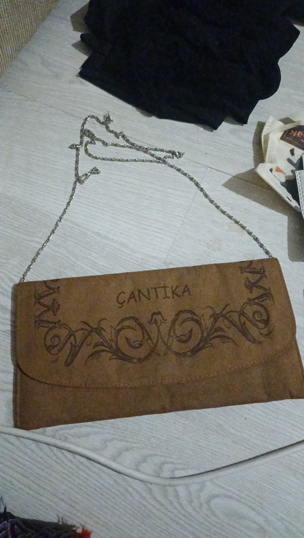 Nakışlı detaylara ve zincir askıya sahip bej kadın clutch çanta, vintage bohem tarzda. Günlük kullanım için uygun.