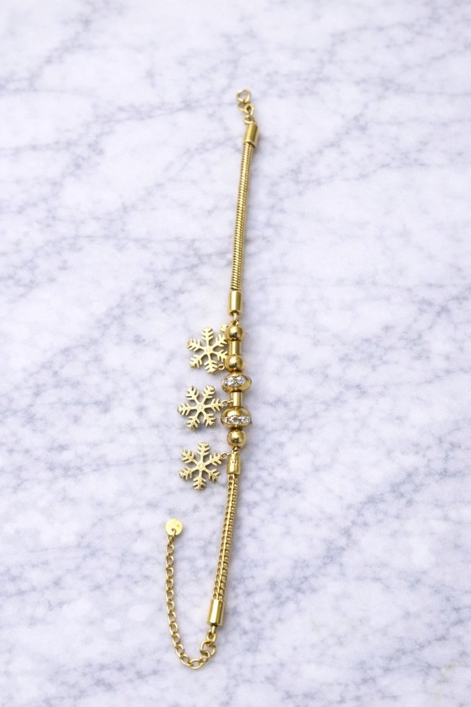 Nakışlı kar tanesi detaylarına sahip altın renk zincir bileklik, günlük kullanım için uygun zarif tasarım. Bohem tarzda, renkli dokunuşlarla. ❄️