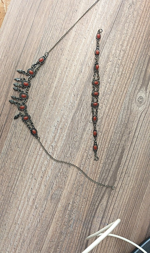 Kırmızı nakışlı detaylara ve zincir süslemeye sahip bohem tarzda kadın el zinciri. Günlük kullanıma uygun, retro ve hippie havası taşıyor.