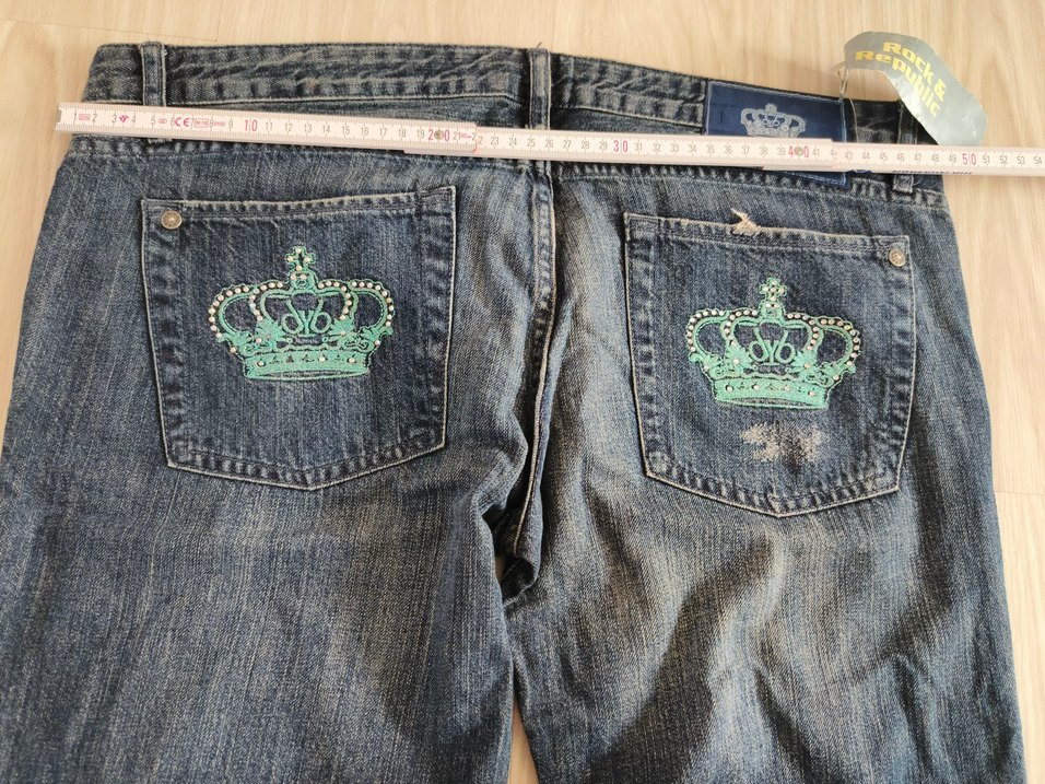 Geçişli kot kumaştan, nakışlı taç desenli ve zincir detaylı, bol kesim midi uzunlukta kadın kot pantolon. Koyu mavi vintage tarzda günlük kullanıma uygun.33 beden
