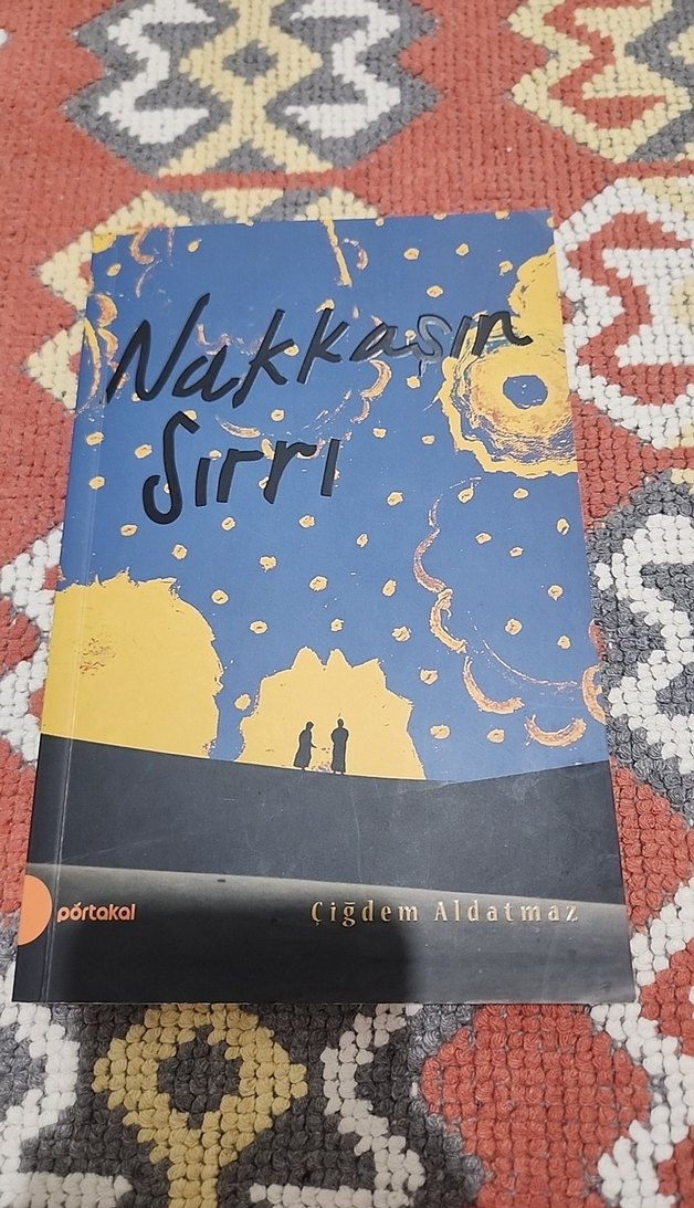 Portakal yayınevinden Çiğdem Aldatmaz'ın Nakkasın Sırrı adlı romanı. Mavi zemin üzerinde sarı soyut şekiller ve silüetler bulunur.