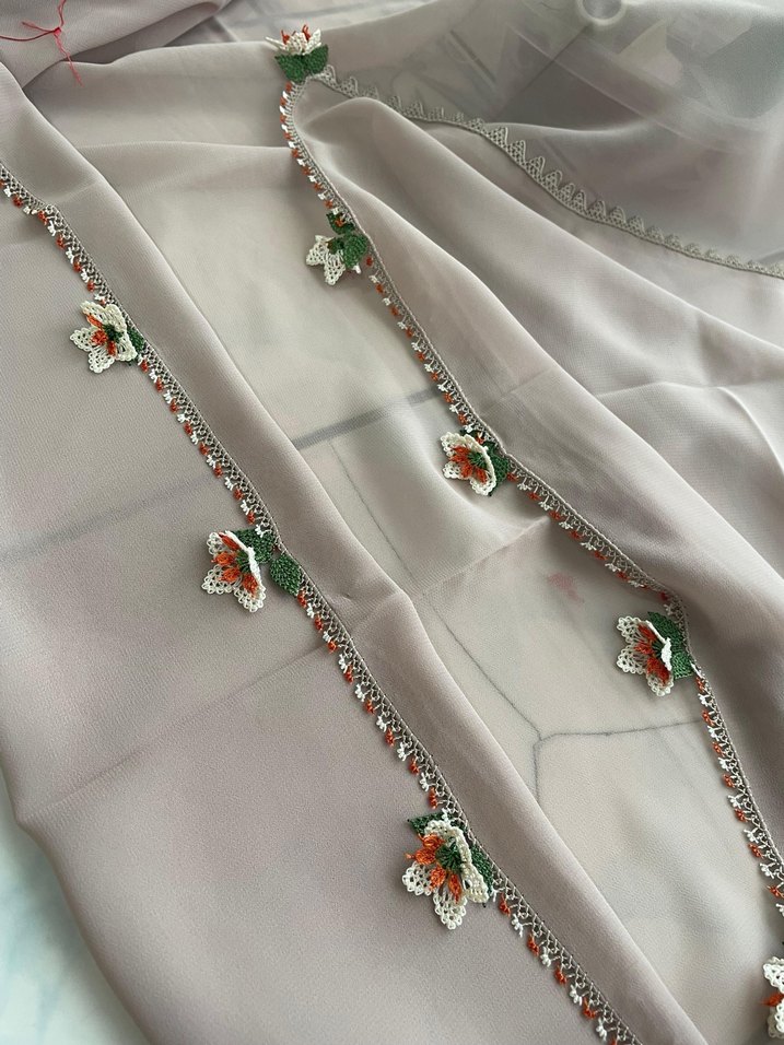 Bej ve gri tonlarında, ipek görünümlü, boncuk işlemeli çiçek detaylarıyla süslenmiş konvansiyonel tarzda kadın şalı. Bohem ve retro tarzına uygundur.