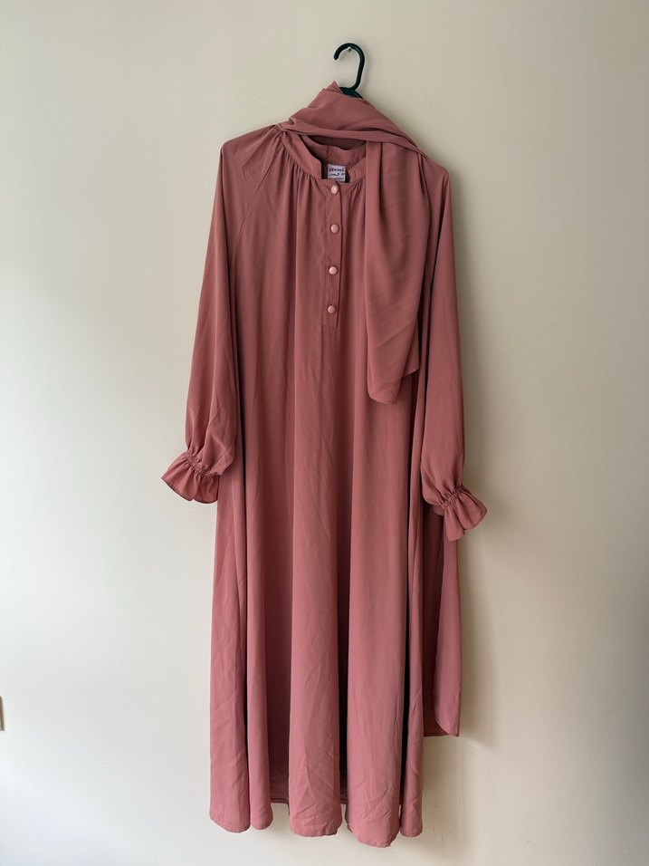 Umre malzemeleri satan yerden satın almıştım kumaşı ipektir şalı ile birleşik tek parçadır gül kurusu rengi yeniden farksız sorunsuzdur
