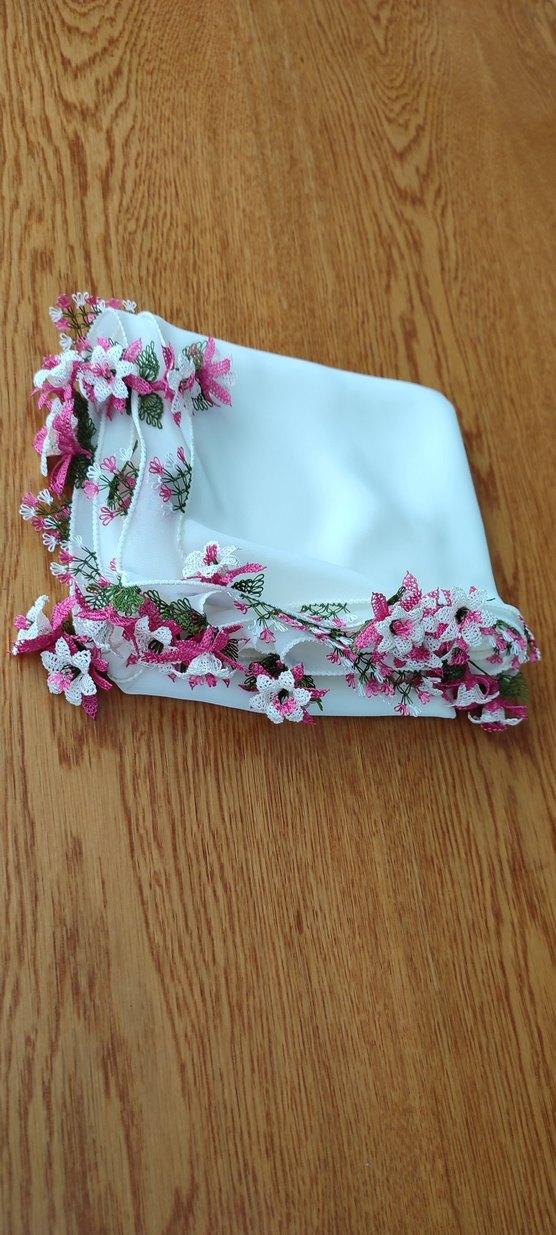 3 kenarı takma oyalıdır. krep kumaş açık krem renktedir
