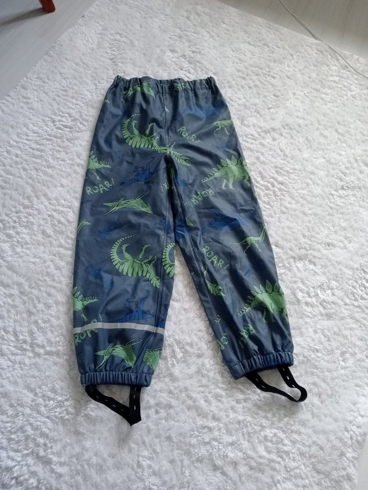 Gri-mavi renklerde, dinozor desenli, bağcıklı ve elastik bilek detaylı erkek çocuk pantolonu. Rahat ve sokak stili için uygun. sayılı giyildi tertemiz