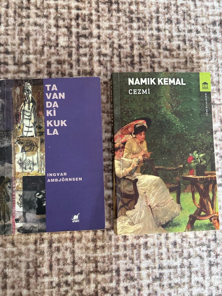 Namık Kemal'in "Cezmi" ve Ingvar Ambjørnsen'in "Tavandaki Kukla" adlı romanları. Kapaklarda eski dönem ve soyut sanat yer alıyor.