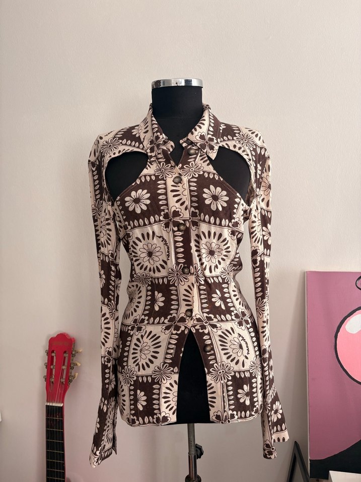 Kahverengi uzun kollu bohem gömlek, baskılı desen, yakası açık ve düğmeli. Normal kesim ve uzun boyda, günlük kullanıma uygun.