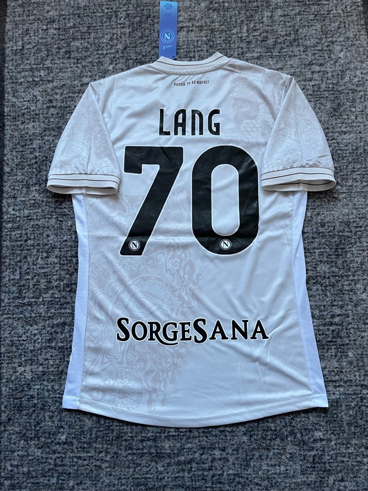 Erkekler için beyaz kısa kollu, baskılı, dantel detaylı, sentetik kumaştan yapılmış, spor ve günlük athleisure tarzına uygun dar kesim forma. Arka yüzde 'LANG' ve '70' numarası ile 'SORGESANA' baskısı bulunur. ⚽