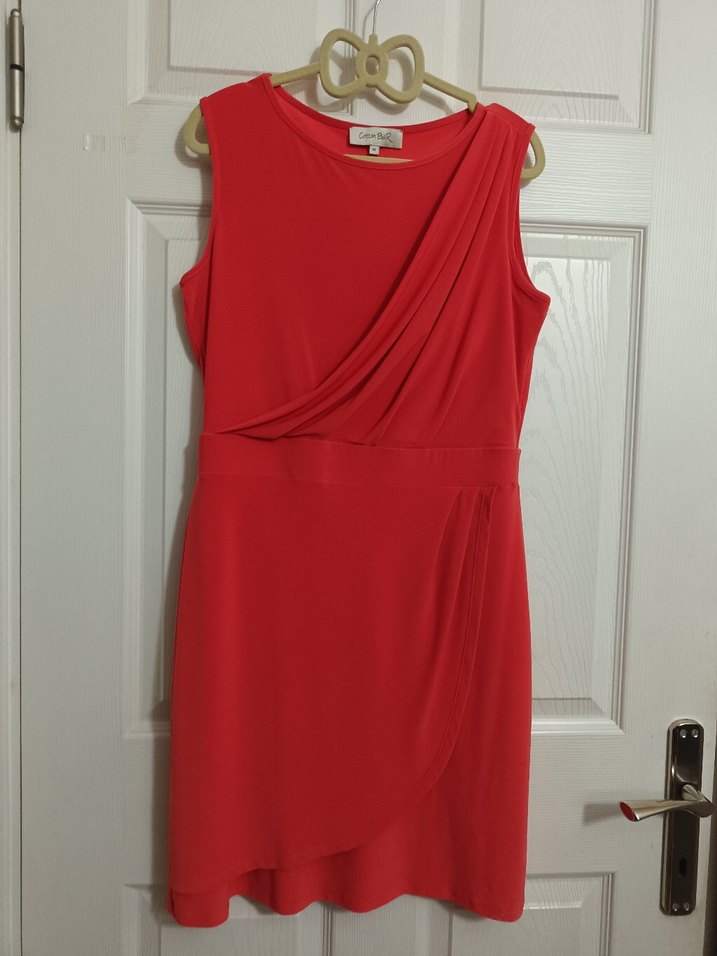 nar çiçeği renginde drapeli ve kolsuz midi elbise, yuvarlak yakalı ve klasik şıklıkta, ofis için uygun modern tasarım. ✨
