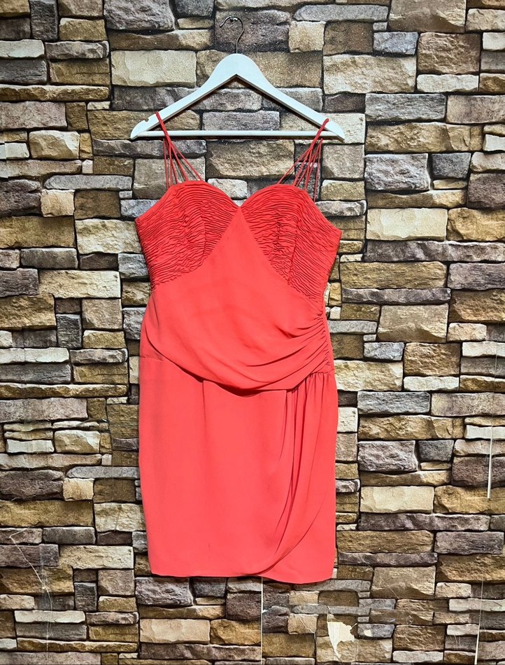 Drapeli detaylı, askılı ve straplez yaka nar çiçeği mini abiye elbise, şık ve cesur görünüm sunar.boy 104 iki kol arası 48 cm