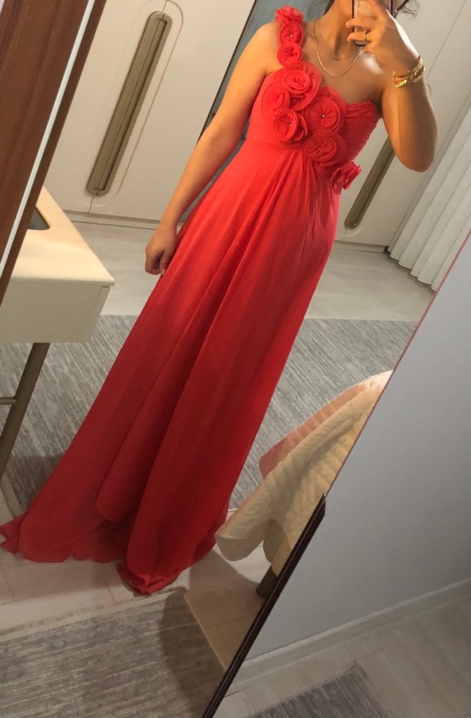 Nar çiçeği renginde straplez yakalı ve drapeli detaylı, vücuda oturan uzun abiye elbise. Kolsuz ve modern klasik tarzda, düğünler için uygun.