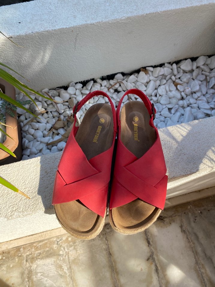 Çok tatlı bir rengi var, tokalı kayışlı ve kauçuk tabanlı, tabanında örgüler var, üstü deri, kadın sandalet, minimalist bohem tarzda. Tabanlarından da göreceksiniz ki hiç giyilmedi.