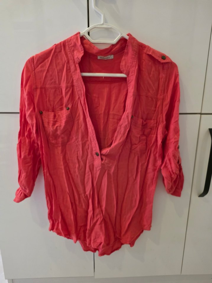 nar çiçeği gömlek, dar kesim, uzun kollu ve V yaka. Düğmeli ve normal midi boyda, gündelik sokak stiline uygun. XL yazıyor ama S M uyumlu