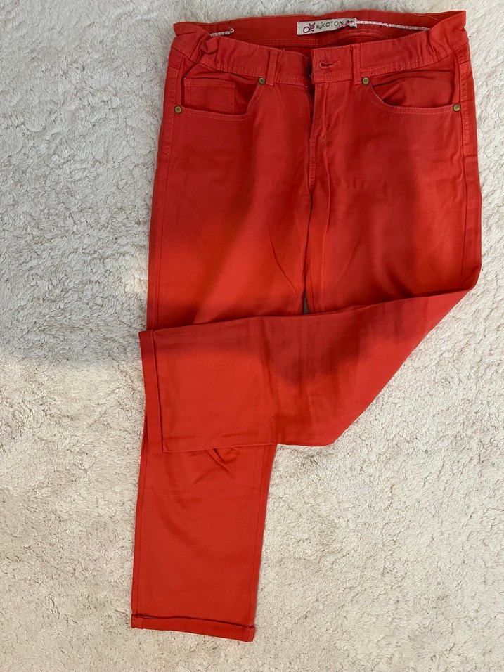 Nar çiçeği renginde(fotoğraflarda daha koyu çıkmış), midi boy, regular fit kadın pantolon. Günlük dış mekan kullanımı için uygundur. Beli bana bol geldiği için iki yandan lastik dikmiştim sökebilirsiniz.