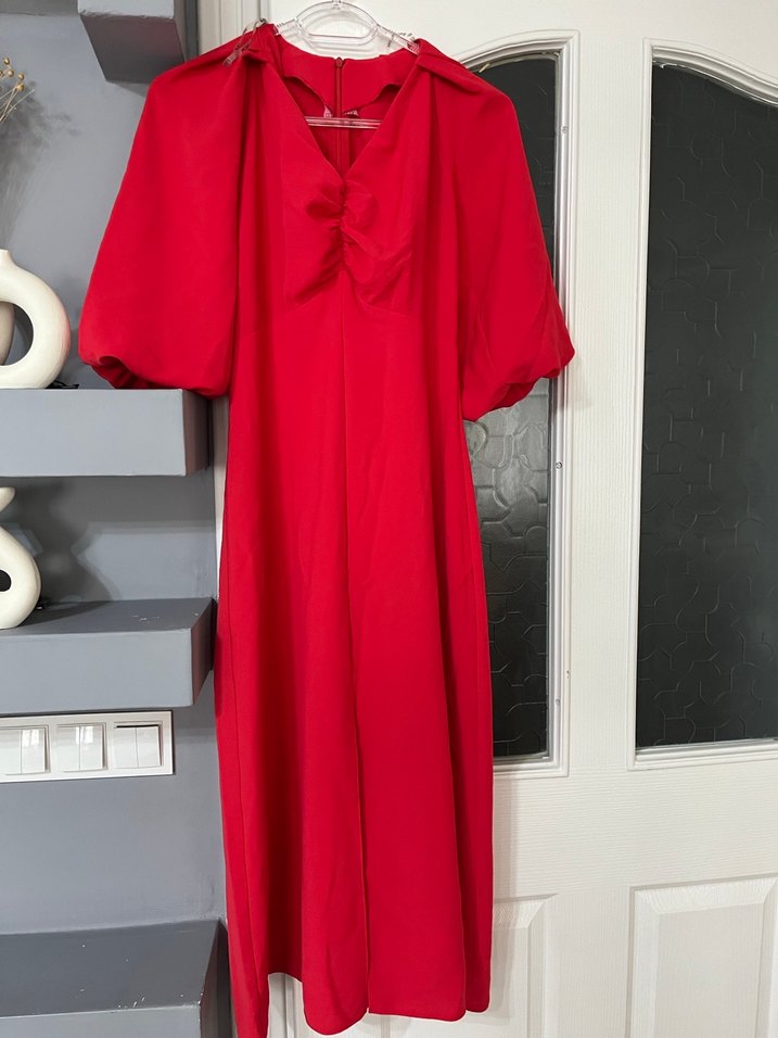 Özel bir butikten alınmıştır. Son fotoğraftaki gibi yırtmacı vardır. Parlak kırmızı, kısa kollu, drapeli detaylara sahip uzun elbise. Modern klasik tarzda, ofis için uygun.