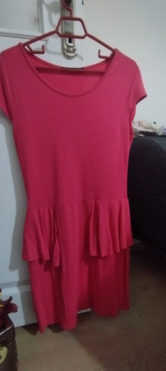 Nar çiçeği midi elbise, kısa kollu. Bel kısmında şık fırfır detayları bulunur.