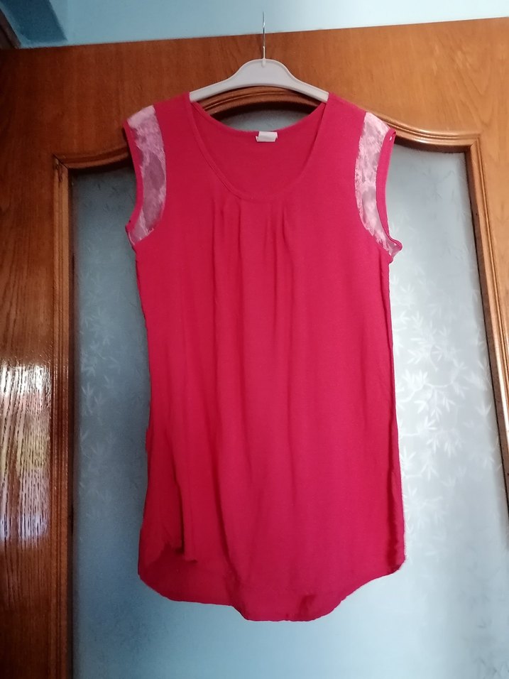 Nar çiçeği renkli, kolu parlak tül detayli güzel bir bluz