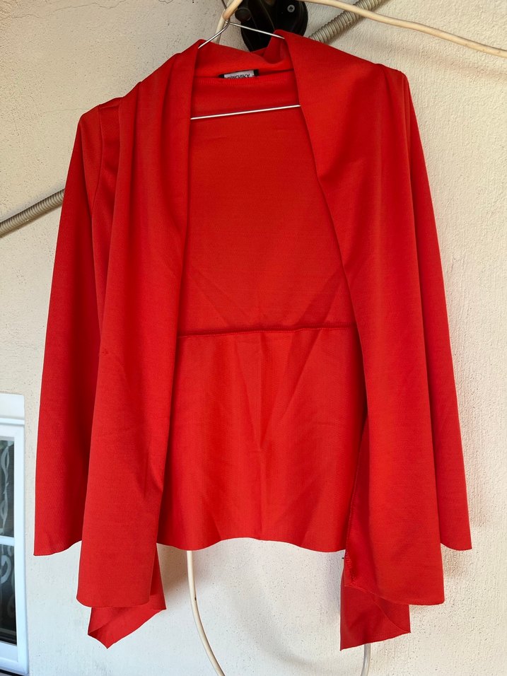 Hiç kullanılmadı. Nar çiçeği renkte, boynu şal detaylı, polyester kumaş, uzun kollu hırka.