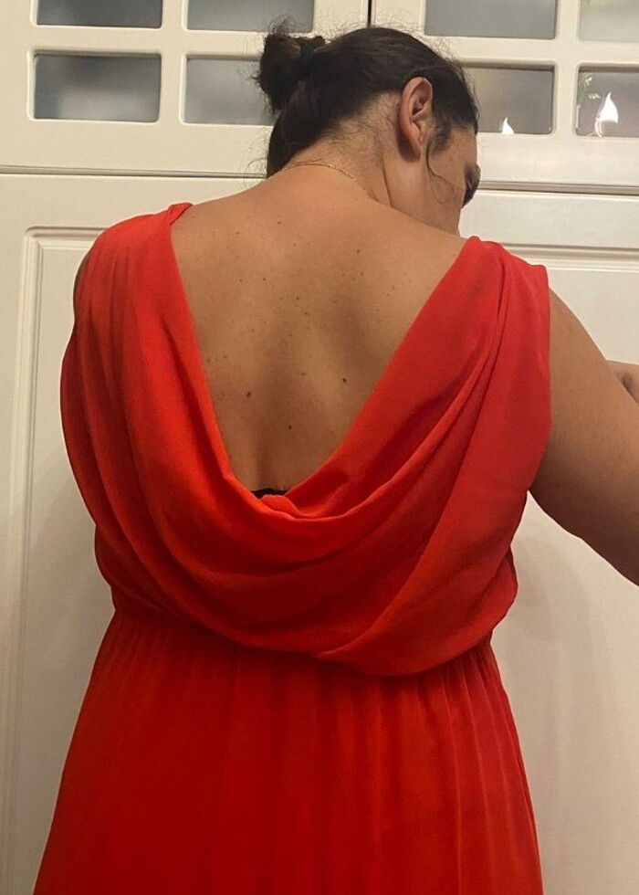 Içi astarlıdır nar çiçeği rengindedir kolye detayı takılıp çıkarılabilmektedir yandan yırtmaçları mevcuttur beli lastikli ve esnektir 44 46 beden rahatlıkla giyinebilir.sadece 1 kez giyildi kusursuzdur. Beden large yazıyor ama ben 87 kilo iken giyindim boyum 163 santim Yani 44 46 beden aralığındayken kullandım hiçbir tadilat görmemiştir mağazadan alındığı gibidir