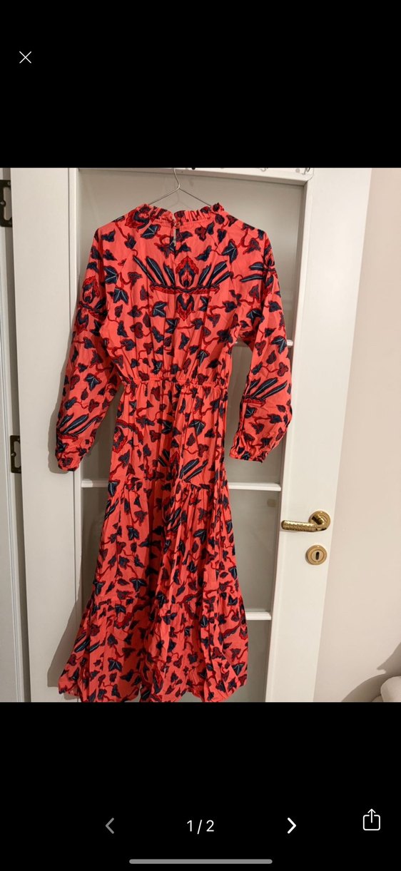 Koyu kırmızı baskılı, uzun ve bol kesim elbise. Yumuşak sentetik kumaştan, fırfırlı ve yüksek yakalı, uzun kollu bohem tarzda.