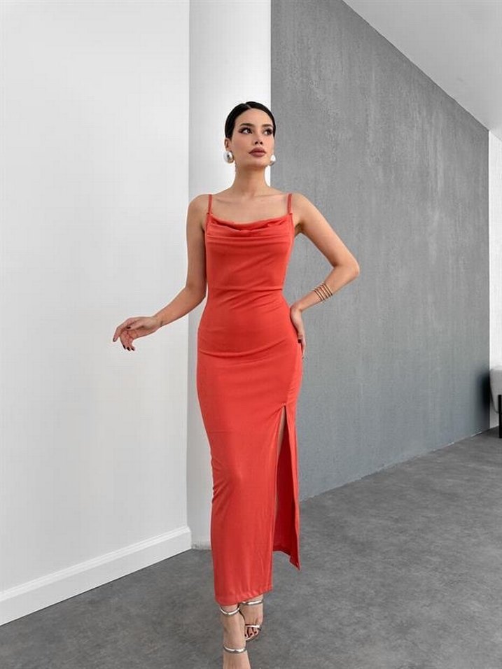 Nar çiçeği, parlak ve ipeksi kumaştan yapılmış, drapeli detaylı ve ince askılı, uzun ve vücuda oturan kadın elbisesi.