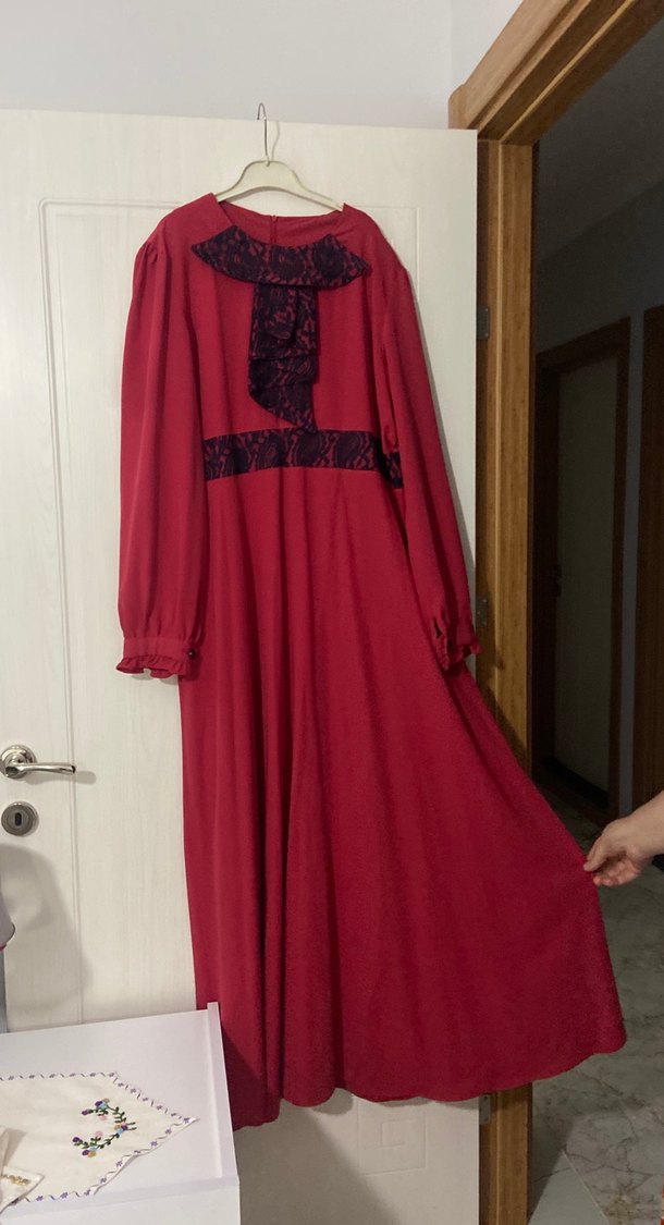 Nar çiçeği renkte, uzun kollu ve bol kesim olan bu elbise, drapeli detaylar ve yüksek yakaya sahiptir. Siyah dantel vurguları ile sentetik kumaştan üretilmiştir. Gotik klasik tarz için uygundur.