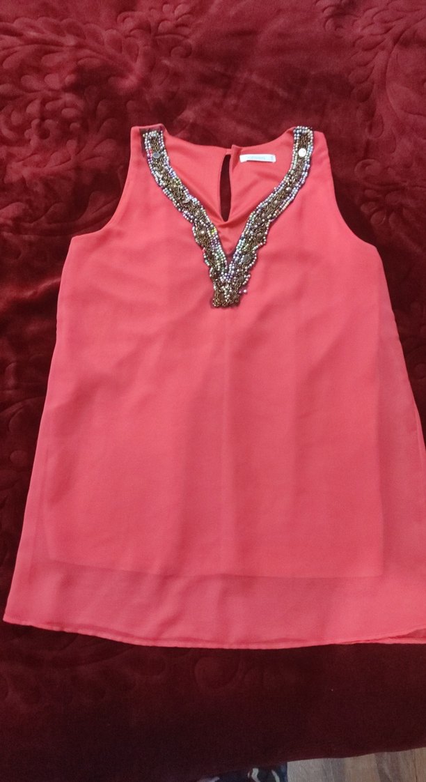 Nar çiçeği, V yaka, boncuk işlemeli kolsuz bluz. Yumuşak sentetik kumaştan, bol kesim ve midi boyda, günlük kullanıma uygun.