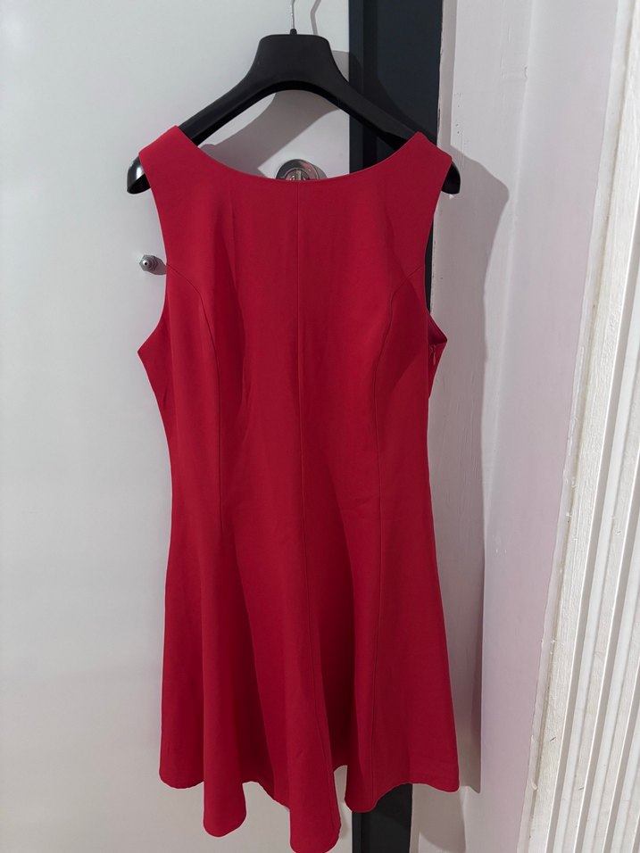 Kolsuz, V yakalı kırmızı midi elbise, drapeli detaylarla şık ve modern bir görünüm sunar. Ofis kullanımı için uygundur.