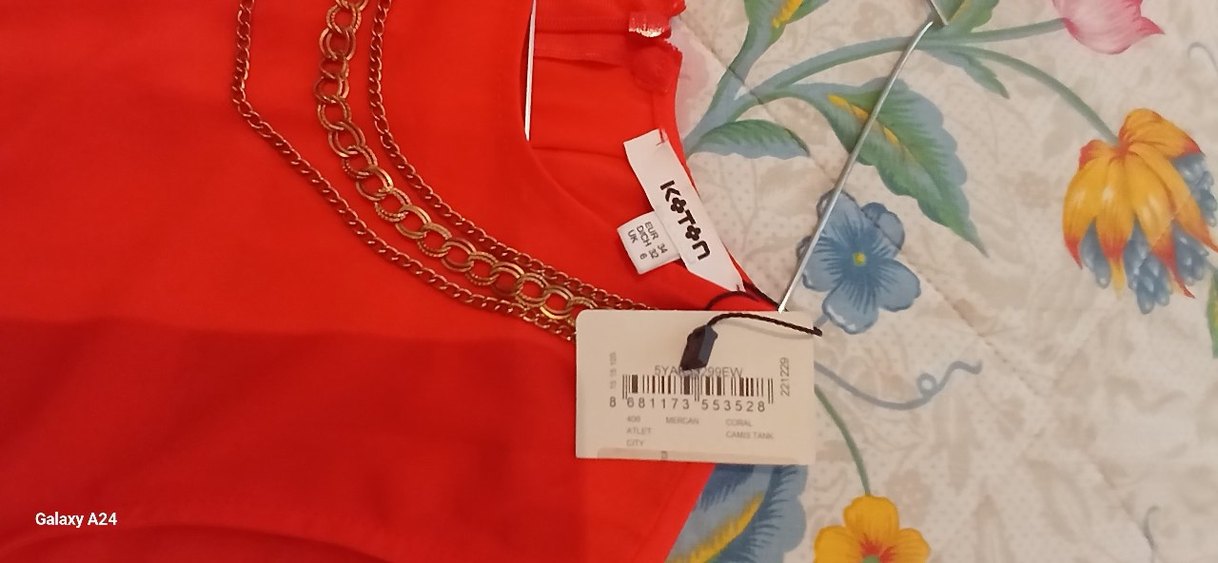 Nar çiçeği renkli, zincir detaylı, yumuşak kumaşlı askısız üst.