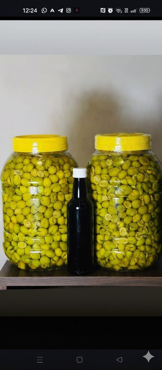 Kesinlikle hiçbir üründe herhangi bir katkı maddesi bulunmamaktadır Tamamen doğal olarak yapılmıştır. 2 adet 5'lik kırma yeşil zeytin, 1 kg el yapımı nar ekşisi