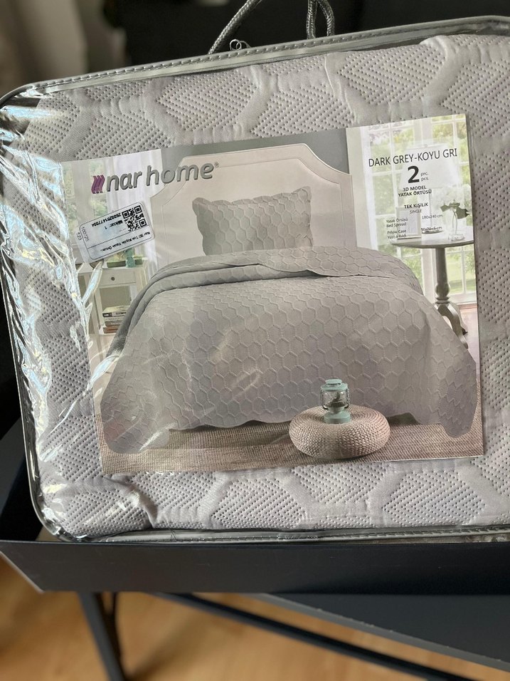 Nar Home markasına ait koyu gri renkli, baskılı desenli 2 parçadan oluşan yatak örtüsüdür. Yatak odasına hafif doku katar. ️