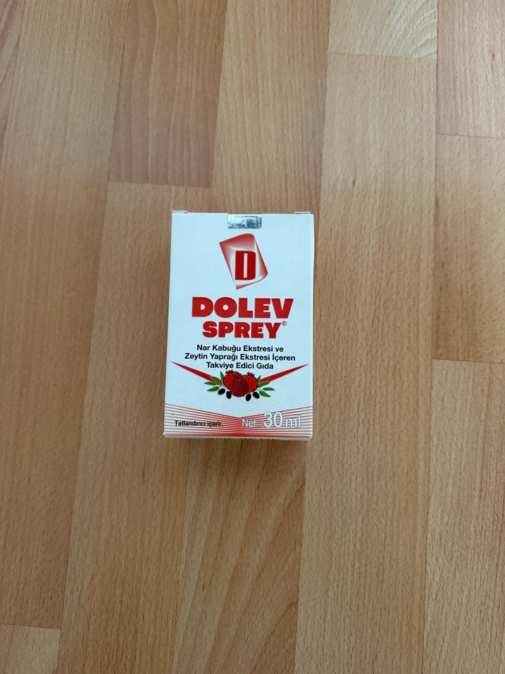 Nar kabuğu ve zeytin yaprağı ekstresi içeren 30 ml Dolev sprey takviye edici gıda. Çekilişten kazandım.Kullanılmamıştır.