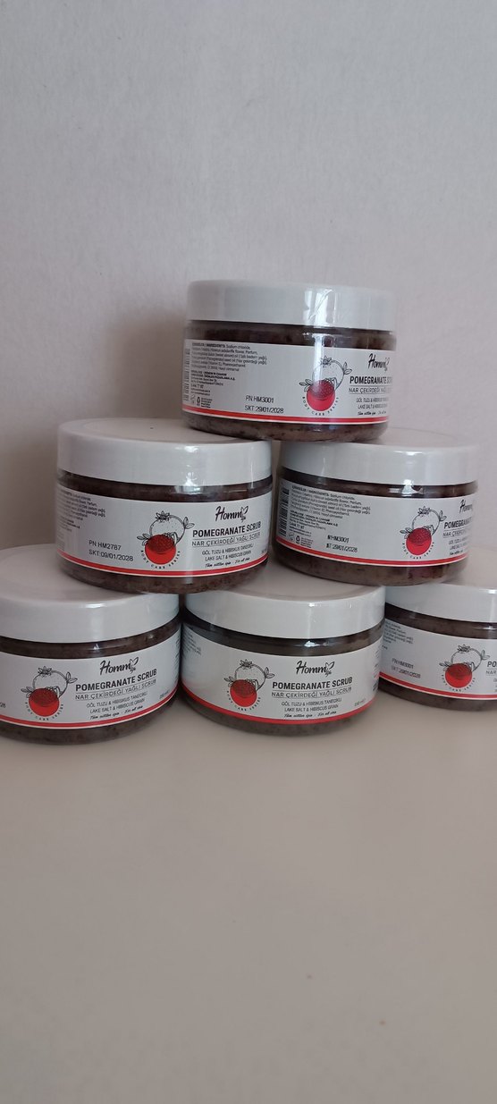 Nar özlü vücut peelingleri, ciltte ölü hücreleri temizleyip yenileyici etki sağlar. Kavanozda sunulmuştur.