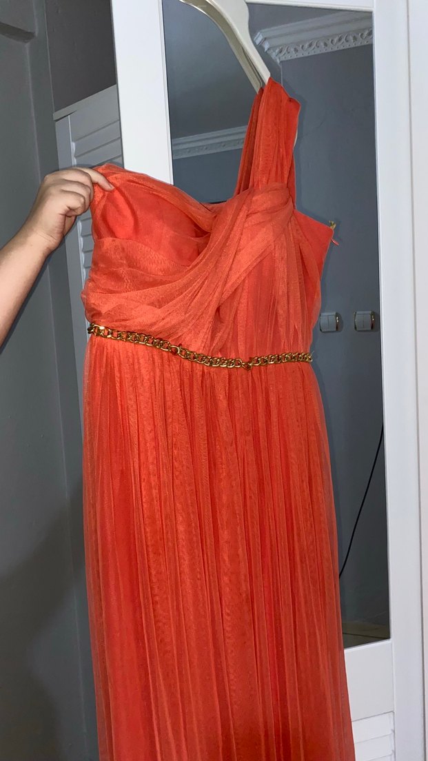 Parlak nar renkte, drapeli ve uzun kesimli abiye elbise. Straplez yakalı, askılı ve vücuda oturan tasarıma sahip. Belde altın zincir detay bulunur.
