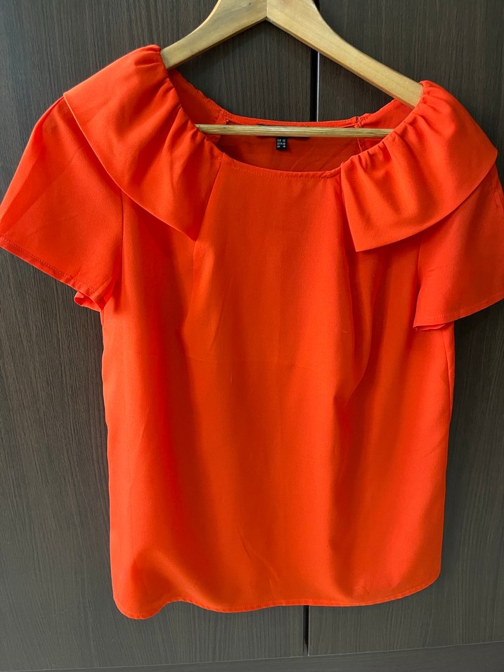Narçiçeği renkte, fırfırlı yakalı ve kısa kollu kadın bluz. Rahat kesim ve normal uzunlukta, sentetik kumaştan üretilmiştir.