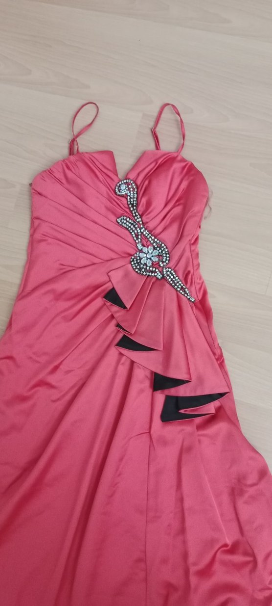 narçiçeği kırmızı renk , straplez yaka ve drapeli detaylı, parlak kumaştan saten uzun, vücuda oturan abiye elbisedir.