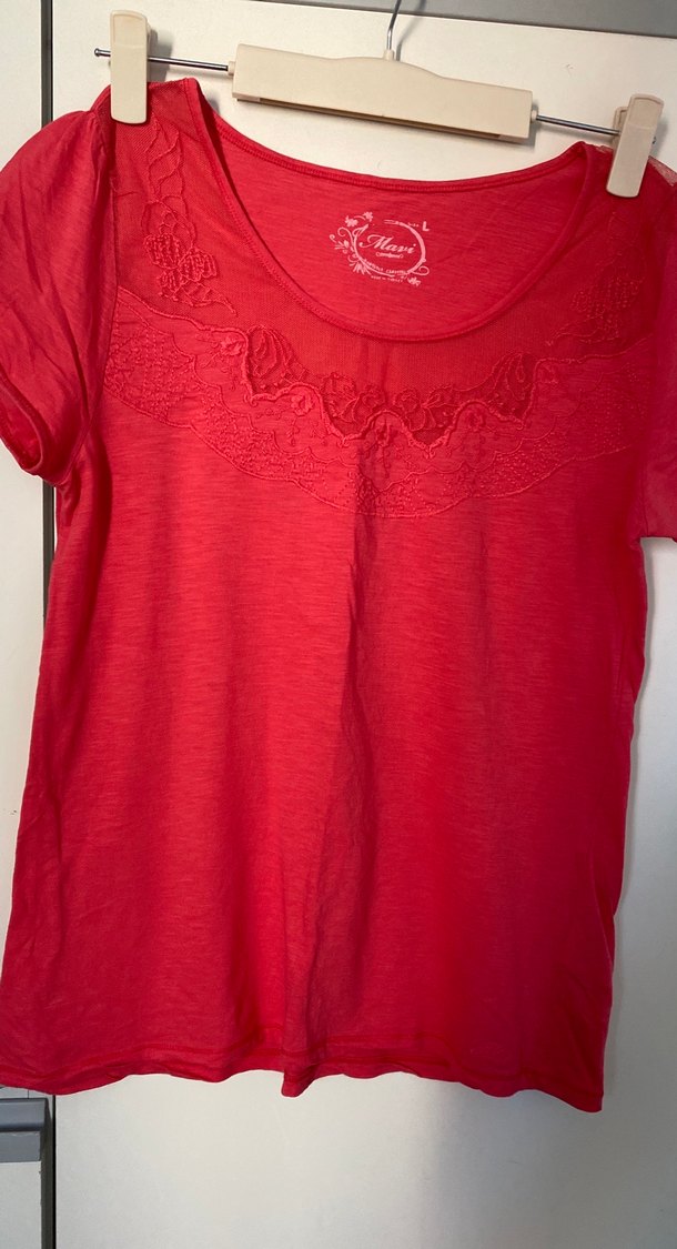 Narçiçeği renkli, kısa kollu, dantel detaylı, yuvarlak yakalı ve bol kesim tişört