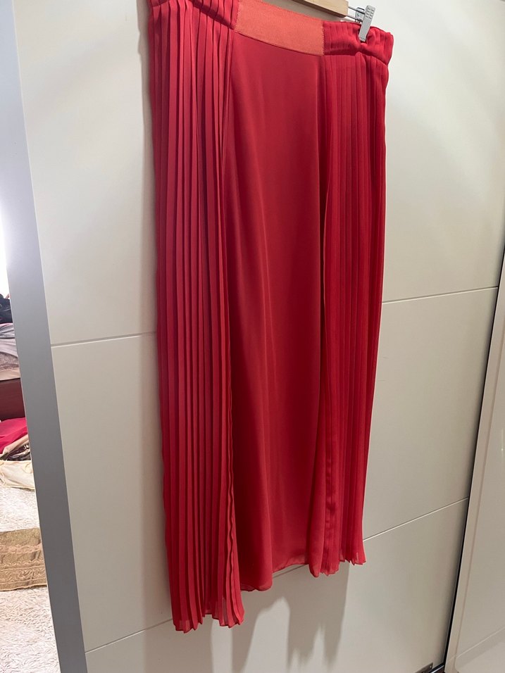 Kırmızı, parlak, şifon kumaştan yapılmış, pilili detaylı ve bol kesim uzun etek. Boy 100cm. Romantik akşamlar için uygundur.