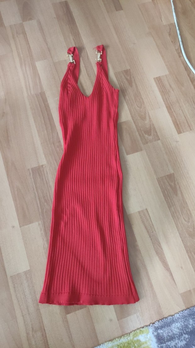 Askılı, V yakalı, pembe triko elbise. Uzun boyu ve fit kesimi ile günlük şıklık sağlar. Renkli ve sokak modasına uygun.
