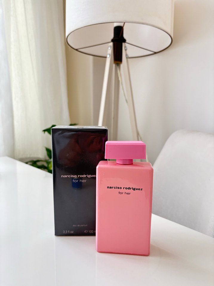 Narciso Rodriguez For Her, şık pembe şişesi ve siyah kutusuyla kadın parfümüdür, zarif ve kendine özgü bir koku sunar.